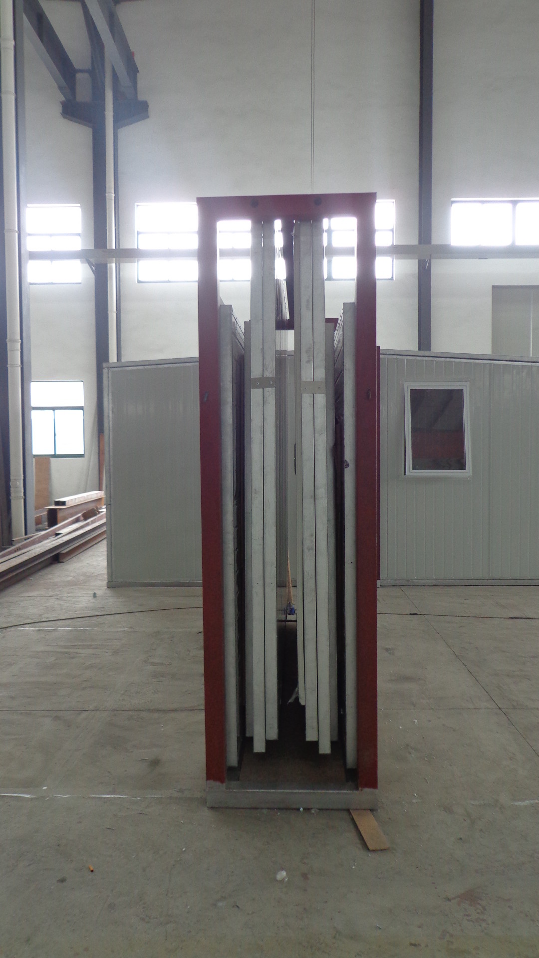 Wall panels are made of 50mm with a 10kg density EPS foam sandwich panel. All panels are fixed in factory and hinged with roofing panel. The thickness of steel for the panel is 0.35mm outside and 0.35mm inside.