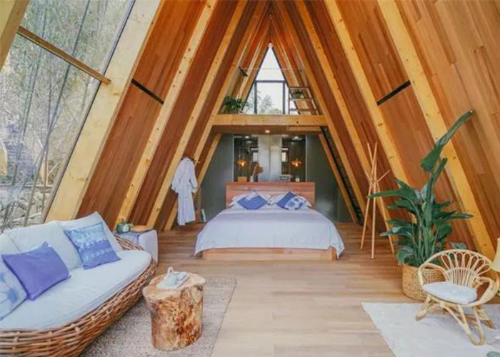 This triangle wooden house has a unique triangle shape. The floor glass window makes the whole room bright and well lit. Tables and chairs are placed on the open deck, which is suitable for sitting there after dinner, blowing, chatting, and looking at stars. It has a kitchen, a bathroom, a bedroom, and a living room. This kind of space is small and practical, which is more suitable for accommodation and hotel projects in the tourist scenic area. It can also be made For a private house.