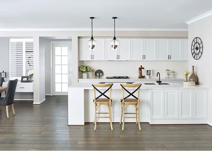 The heart of the home is an open-plan kitchen, seamlessly flowing into the dining area. This space is perfect for daily meals and casual gatherings. From the dining area, elegant aluminum sliding doors open to reveal a true highlight: a covered outdoor room. This versatile space effortlessly extends your living area, ideal for year-round enjoyment, from morning coffees to evening entertaining.