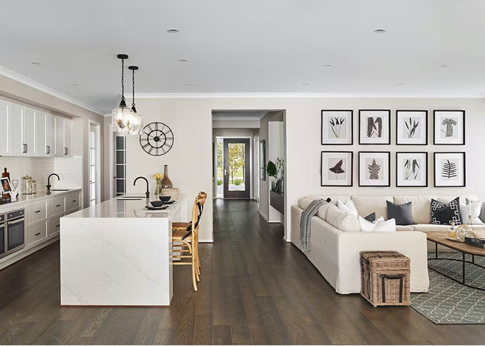 Tucked at the rear of the home for added tranquility, the living room provides a separate, cozy retreat for relaxation and family time. Completing the practical layout, a convenient two-car garage is situated on the right side of the property.