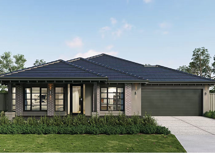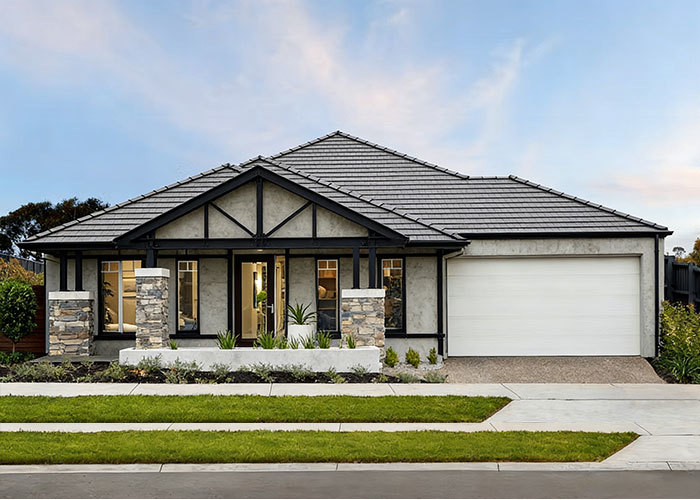 Reims House is a single-story single-family home designed with comfort and everyday living in mind. The entrance is marked by a welcoming portico that gives the façade a calm and elegant presence. On the right side of the house, there is a garage large enough for two cars, providing direct and practical access to the home.